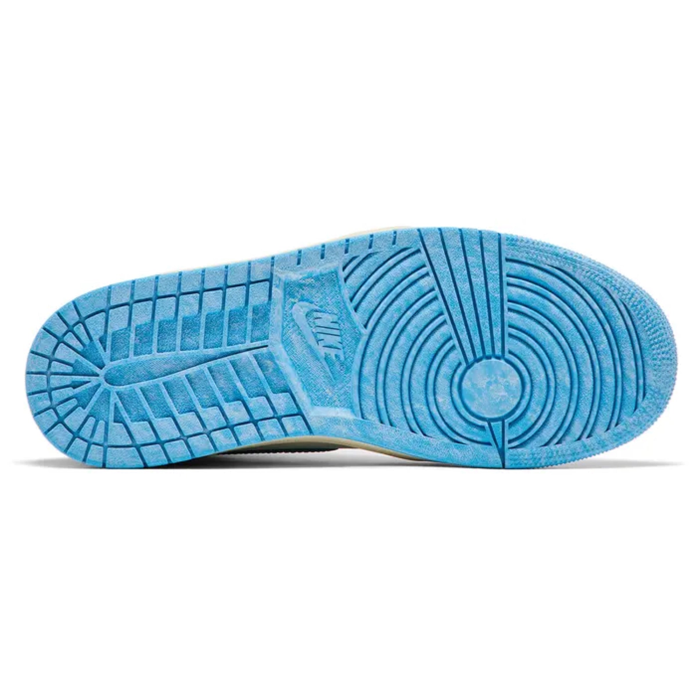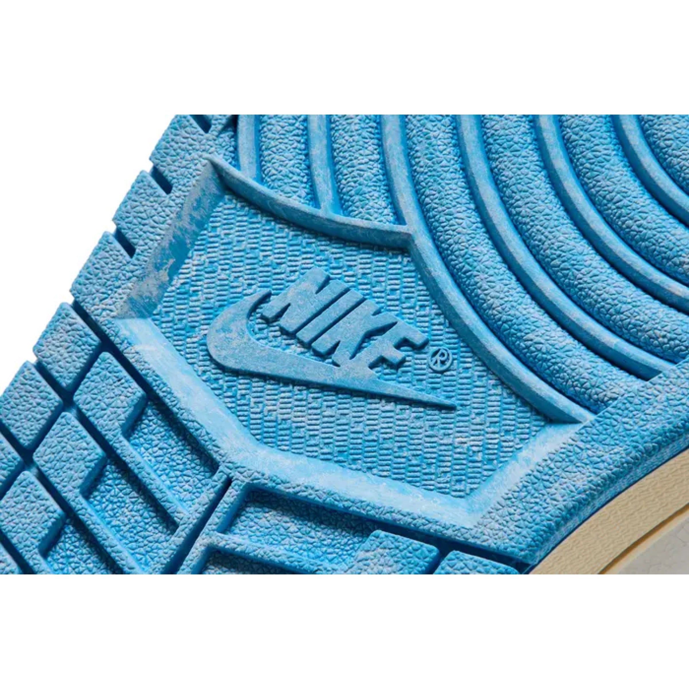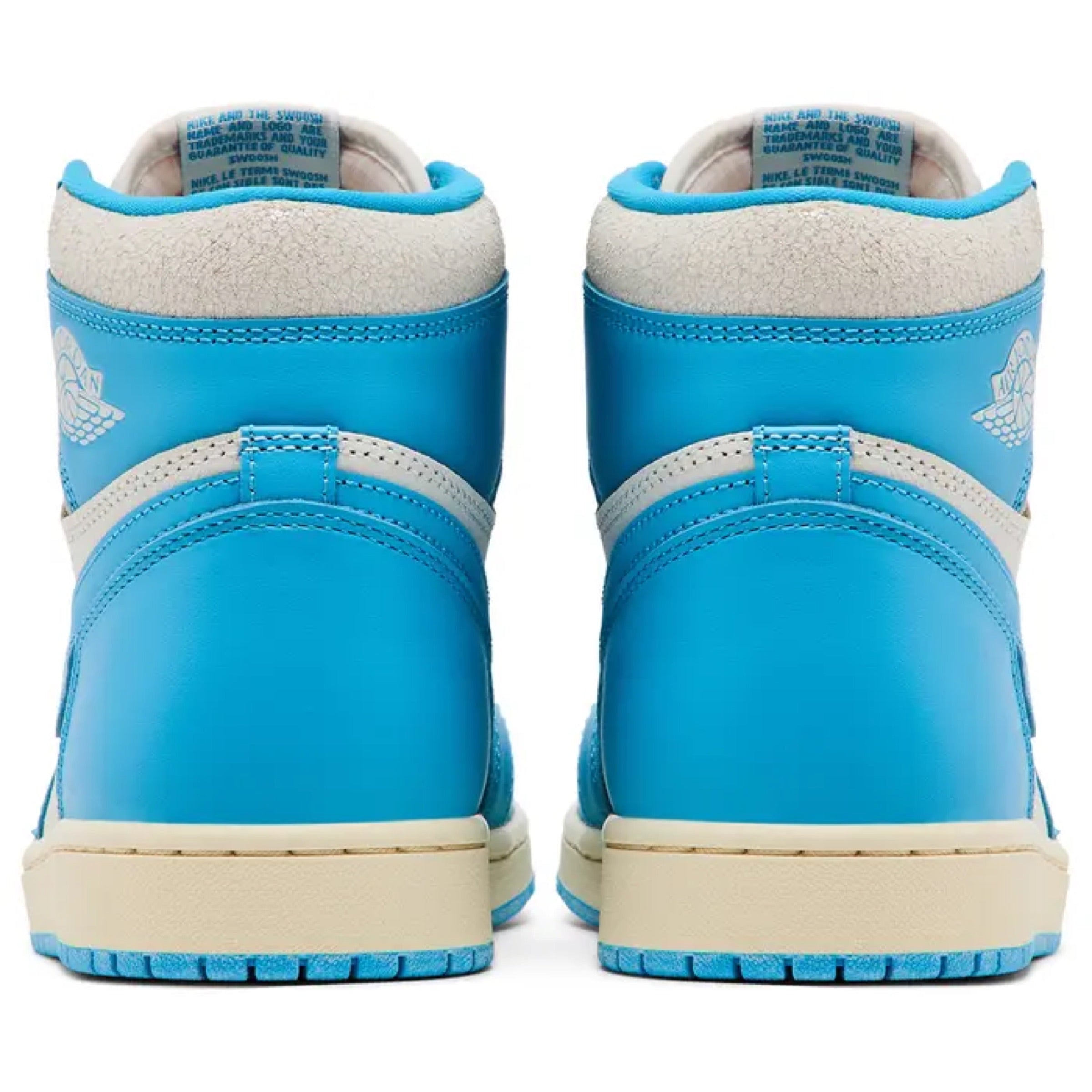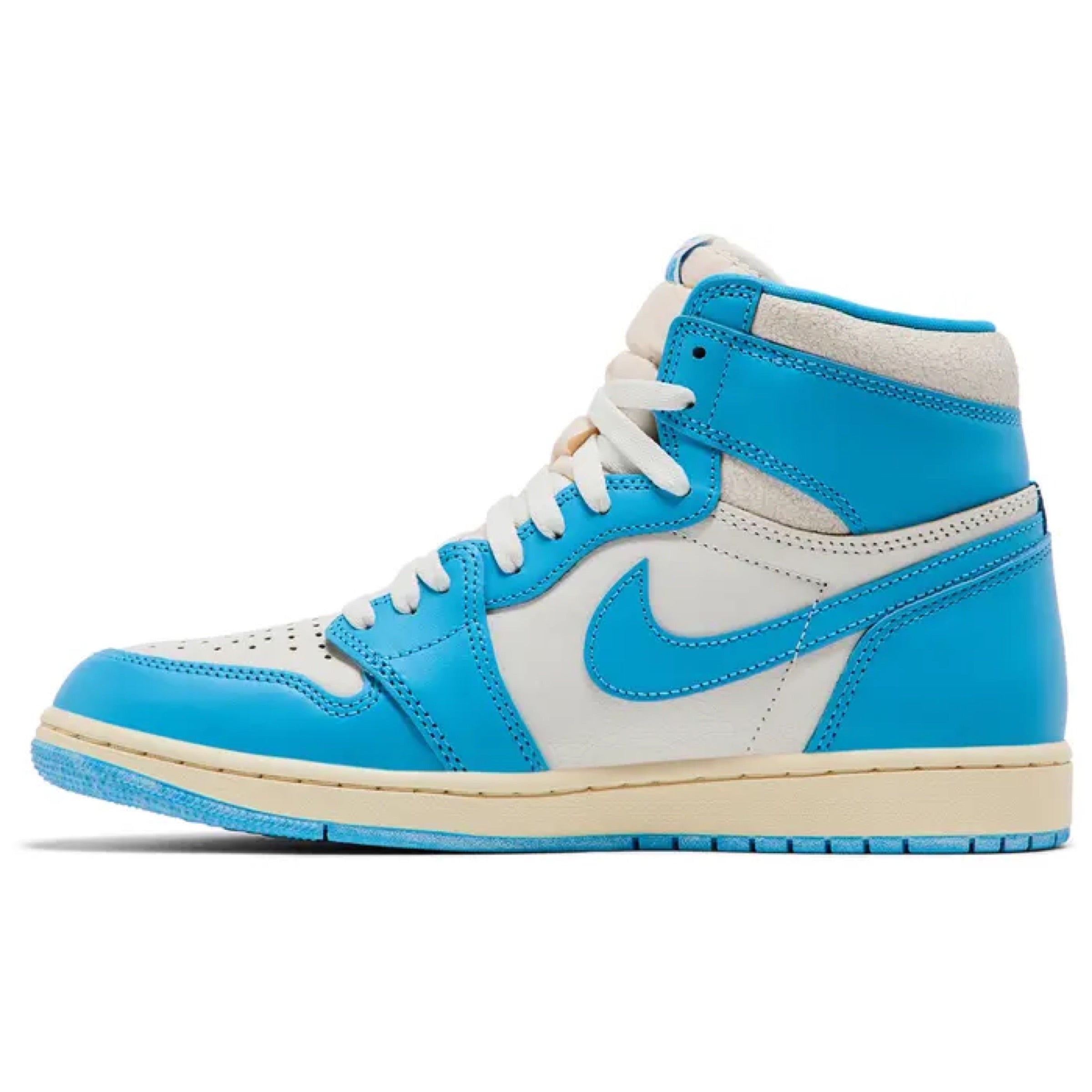 The Air Jordan 1 Retro High OG 'UNC Reimagined' pays homage to Michael Jordan's alma mater, featuring a white cracked leather upper with Dark Powder Blue leather overlays and a color-matched Swoosh. The iconic Wings logo is embossed on the lateral collar flap, while a woven Nike Air tag adorns the breathable nylon tongue. A vintage pre-yellowed finish is applied to the midsole, augmented with Air-sole heel cushioning and supported by a distressed powder blue rubber outsole.