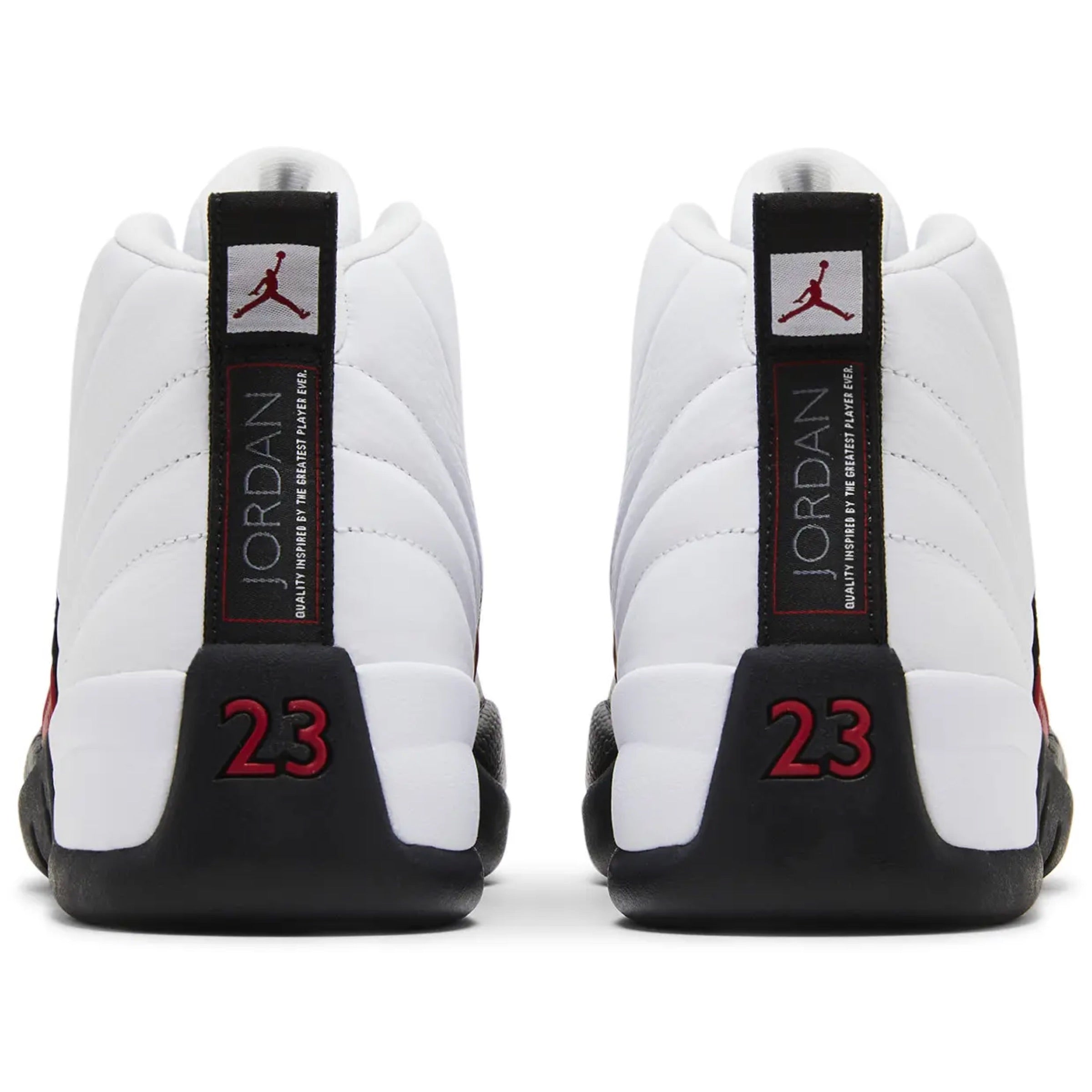 The Air Jordan 12 Retro ‘Taxi Flip’ also known as 'Red Taxi' adds splashes of color to a familiar colorway inspired by the OG 'Taxi' release. Crafted from tumbled white leather, the upper features radiating stitched lines and a lizard-textured mudguard in a contrasting black finish. A crimson Jumpman logo is embroidered on the tongue, matching a midfoot TPU overlay. Performance benefits include a lightweight Phylon midsole with full-length Zoom Air cushioning and a carbon fiber spring plate.