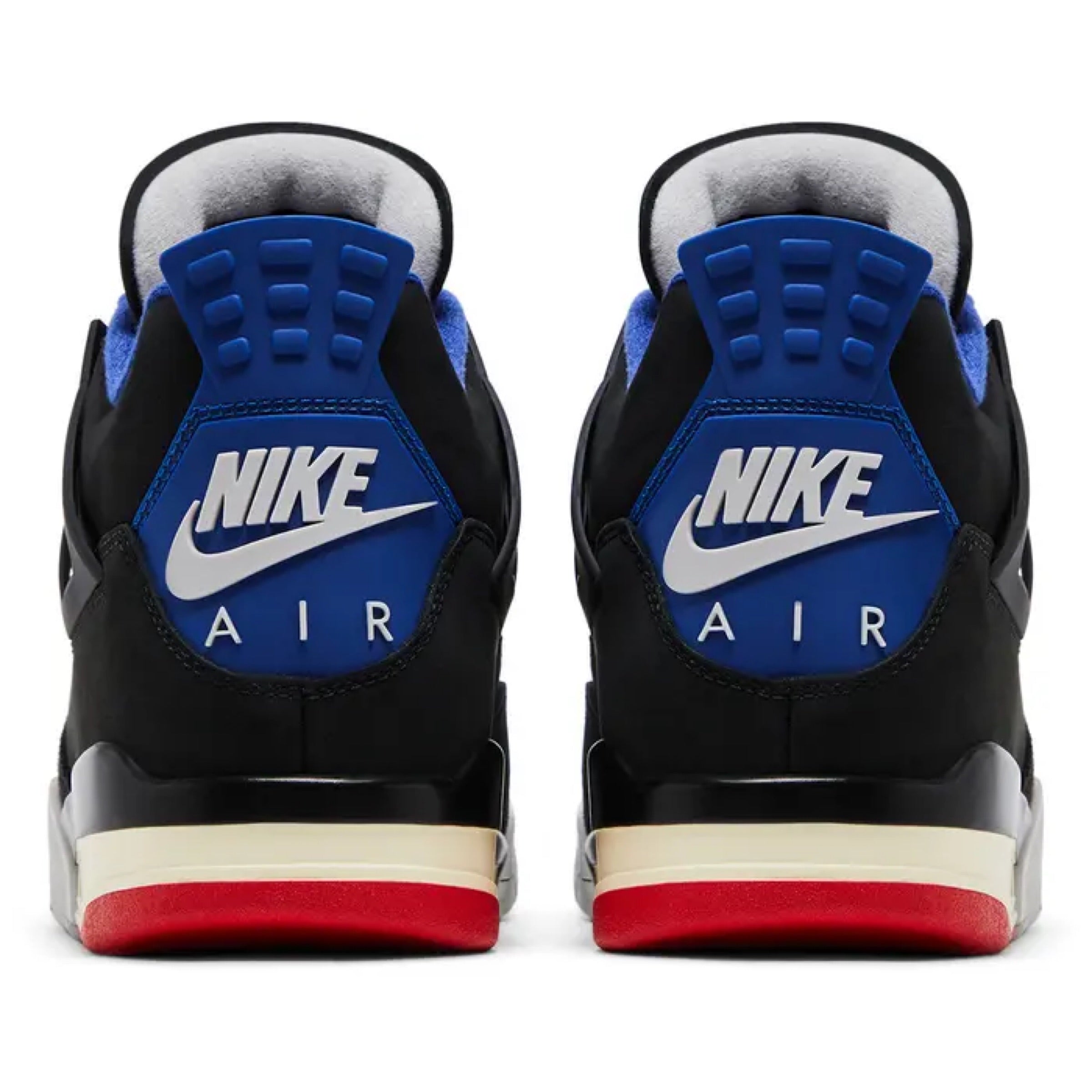 The Air Jordan 4 Retro 'Rare Air' makes use of a black nubuck upper with quarter panel netting, TPU support wings, and molded eyelets in matching black and Fire Red. Outlined in contrast white stitching, a grey suede overlay reinforces the forefoot. The collar is lined in royal blue textile, matching a heel tab marked with Nike Air branding. Interchangeable Velcro patches decorate the tongue, while a 'Rare Air' logo graces the sockliner. Anchoring the sneaker is an Air-assisted polyurethane midsole, featuring a color-popped accent in royal blue and a splash of black around the heel.