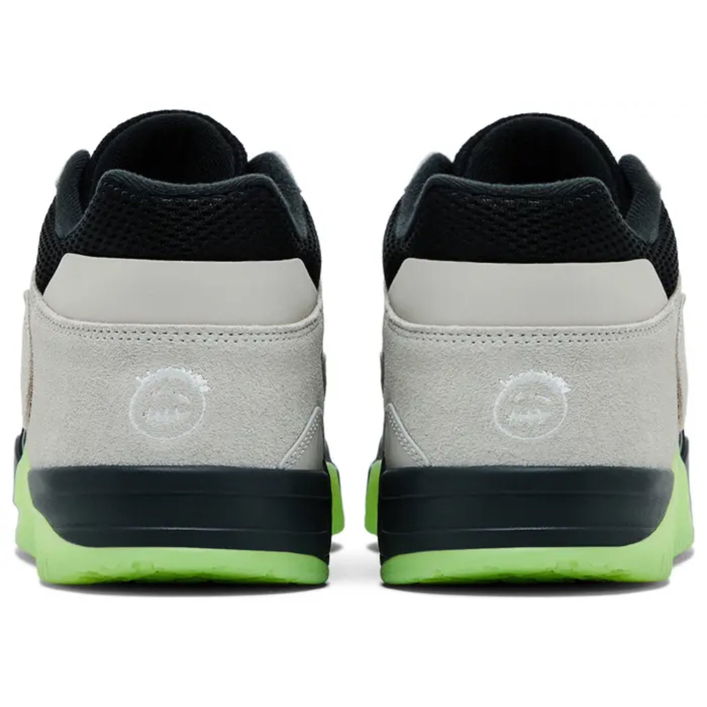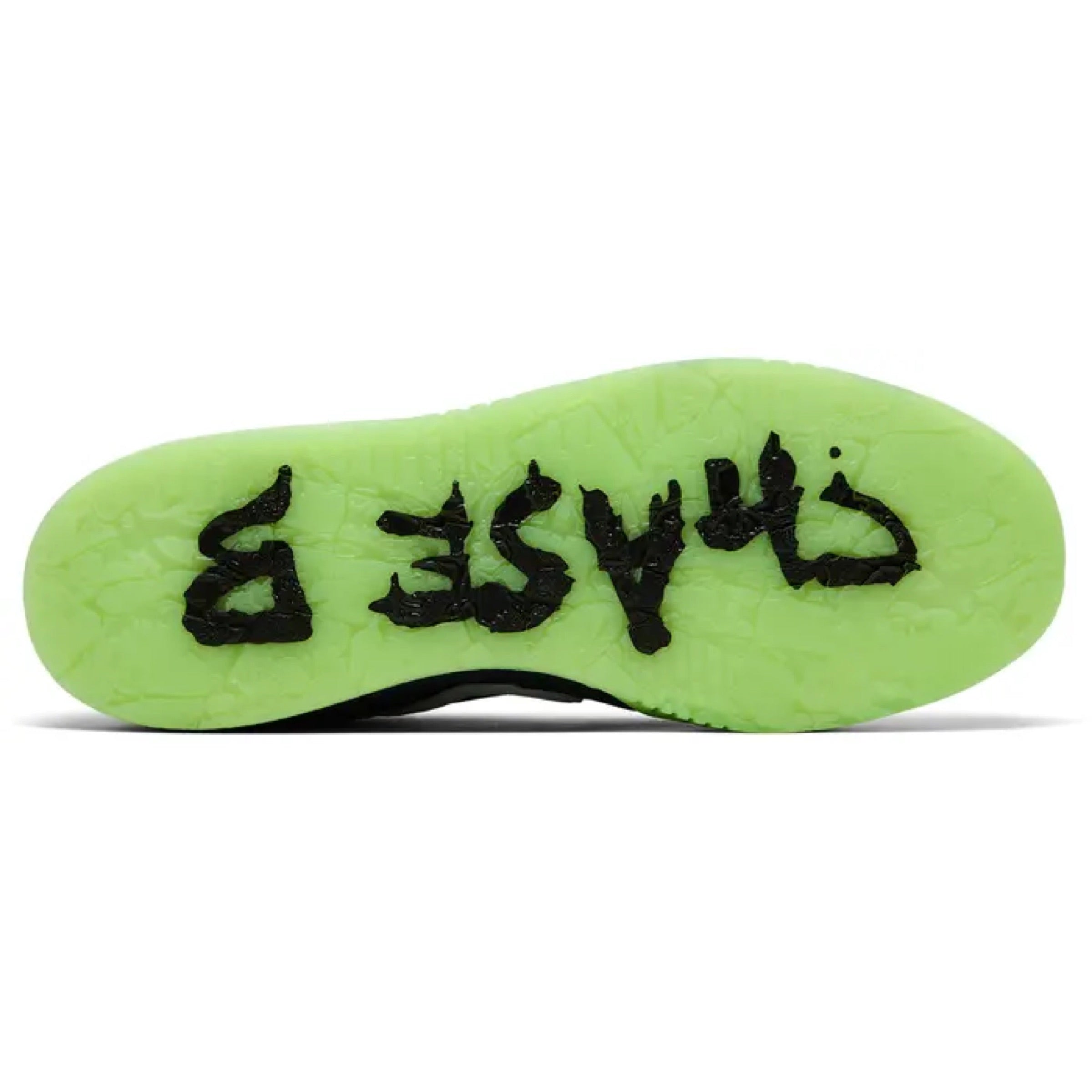 The Chase B x Travis Scott x Jordan Jumpman Jack TR 'Black Night Silver' utilizes a mixed-material upper, featuring a breathable black mesh base with off-white suede construction. Black ostrich leather is deployed on an adjustable midfoot strap outlined in reflective piping. A reverse off-white suede Swoosh adorns the lateral side panel, while a pink embroidered Jumpman graces the tongue. Underfoot, a green-tinged glow-in-the-dark rubber outsole wraps up the black foam midsole.
