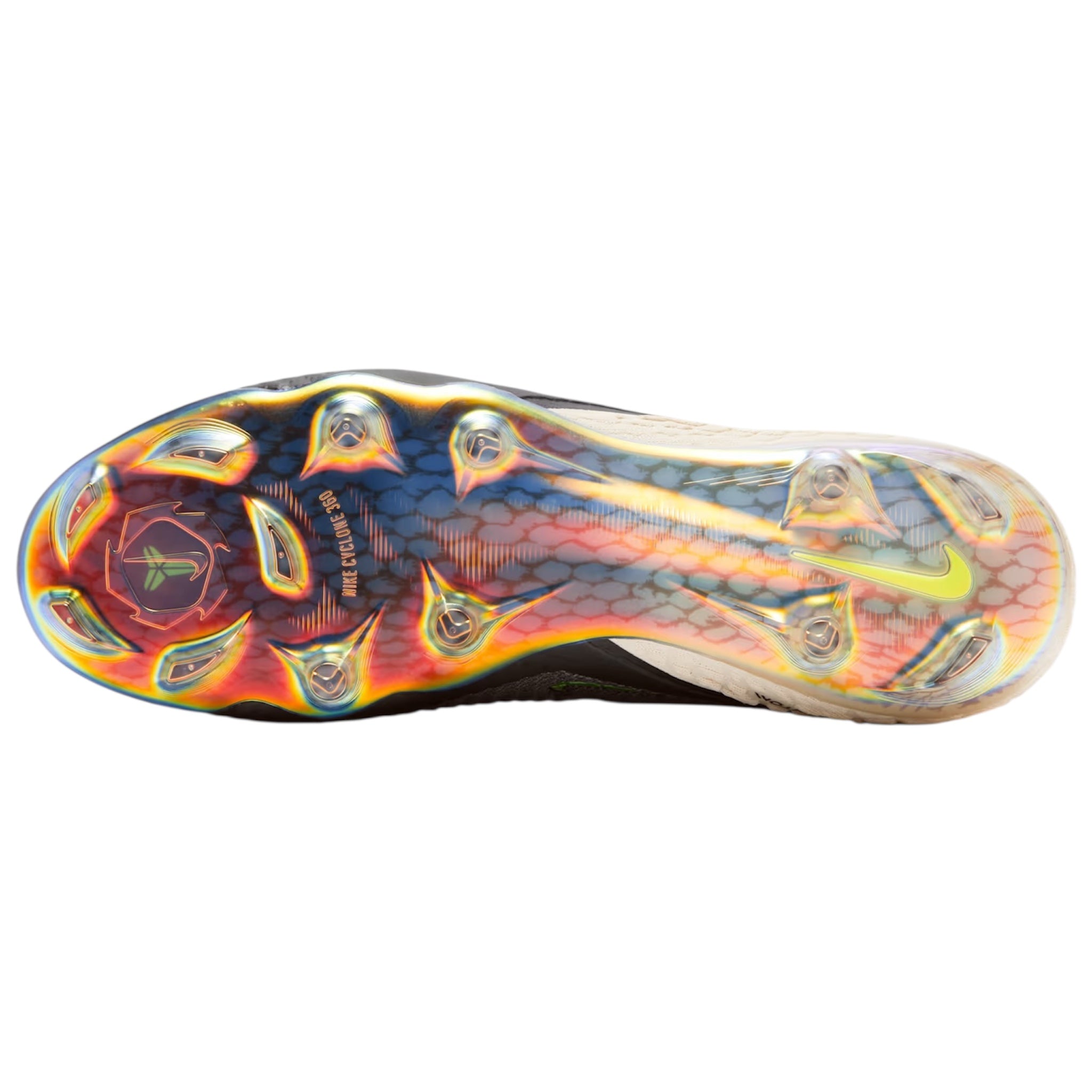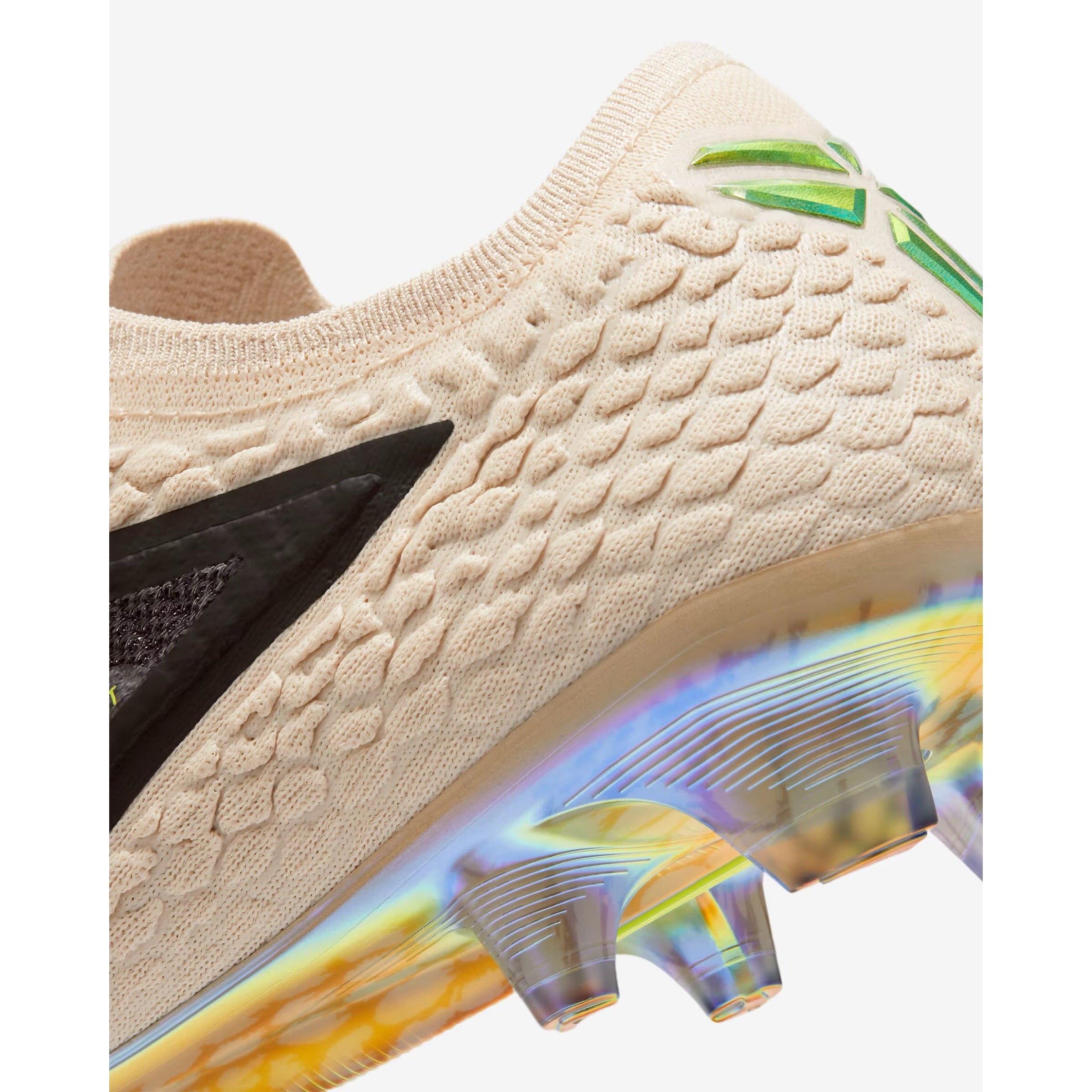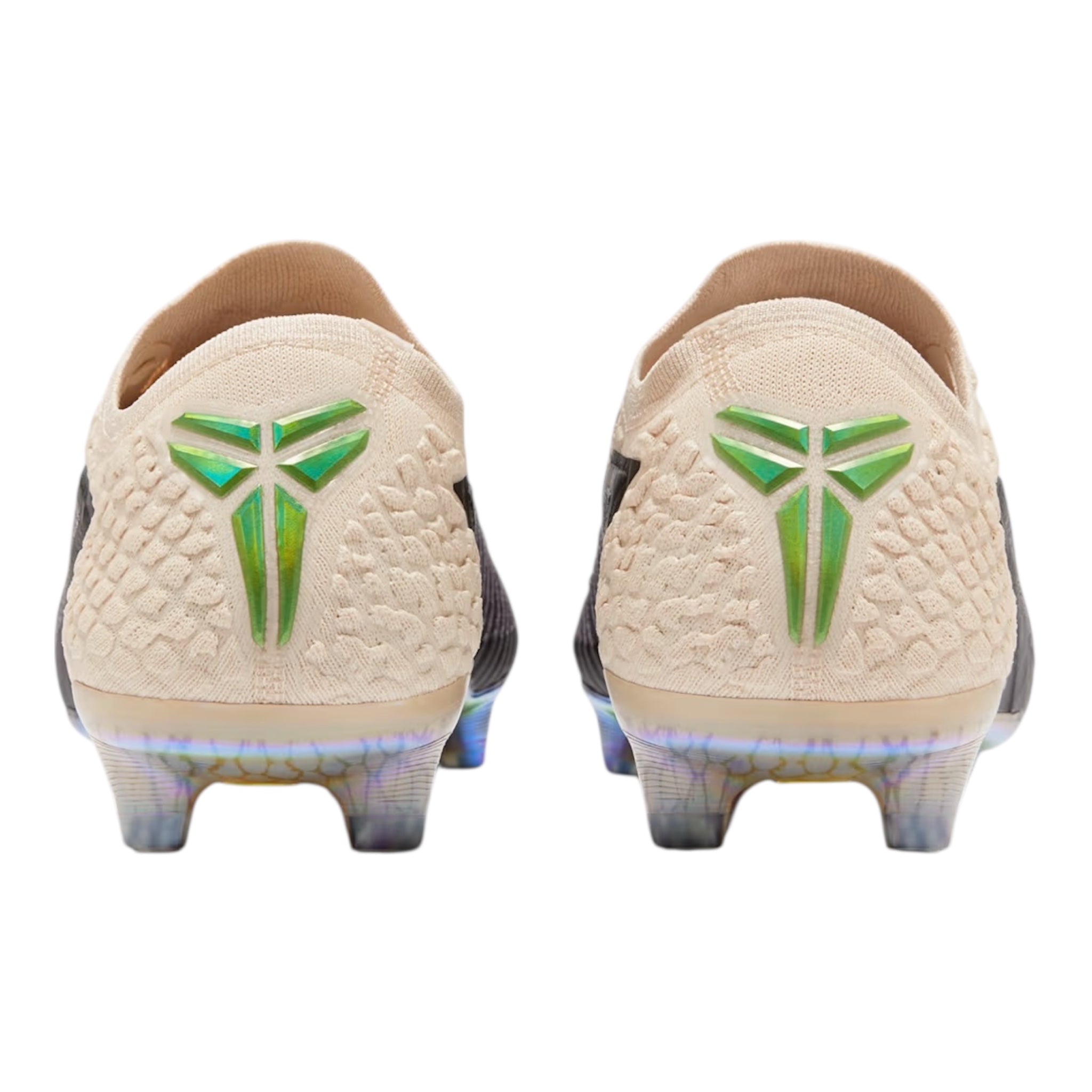 Echoing past “Mamba” sneaker designs, the silhouette showcases a sail reptile-inspired texture. For a striking contrast, iridescent green accents highlight the forefoot Swoosh, heel counter, and tongue logo. Sticking to the “Mamba” theme, the outsole is fitted with cleats designed to resemble fangs. Inside, the design is finished with custom insoles featuring a snakeskin pattern, adding a distinct touch to the boots.