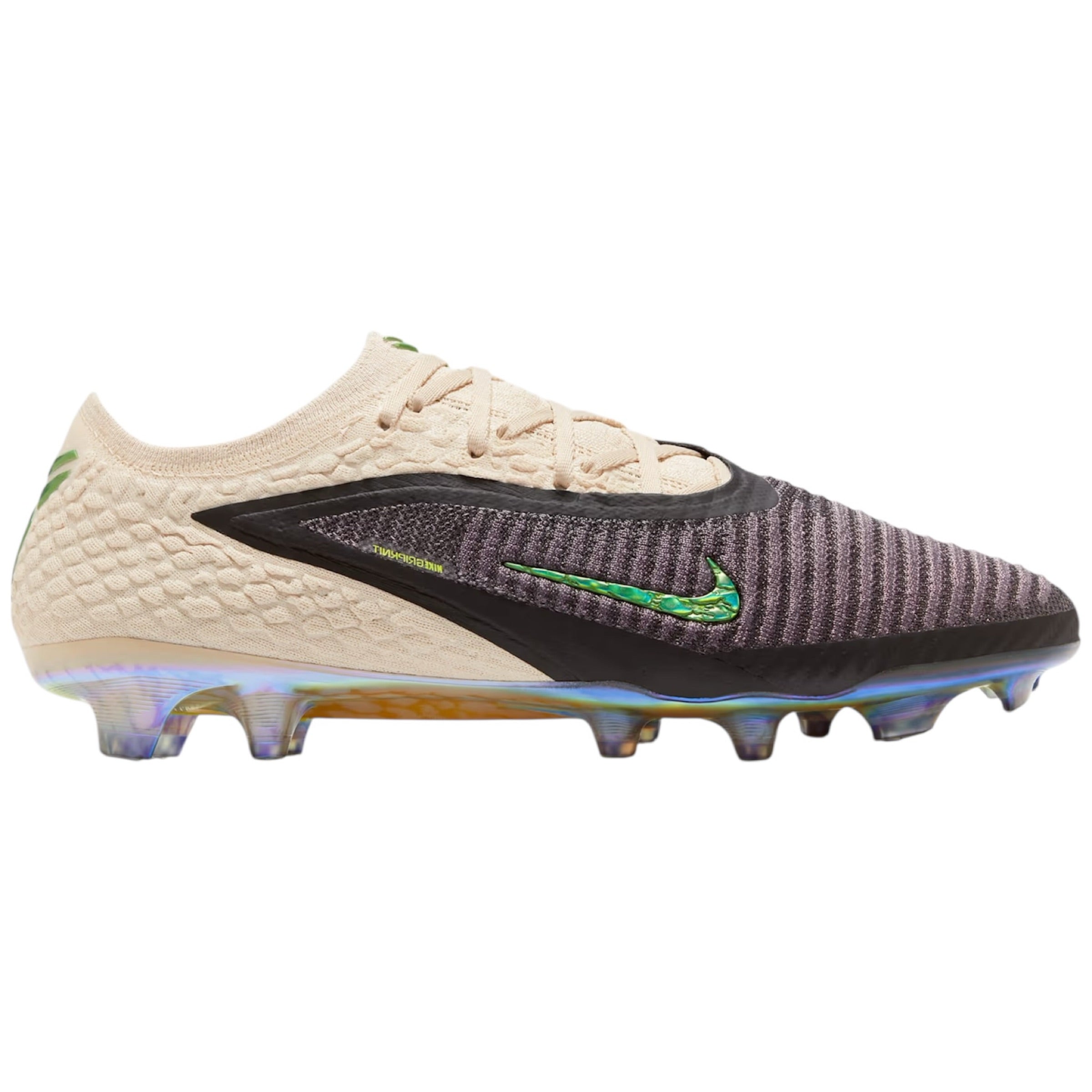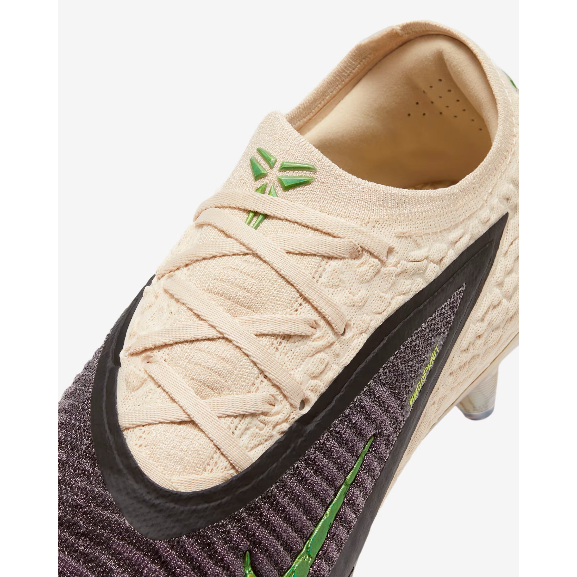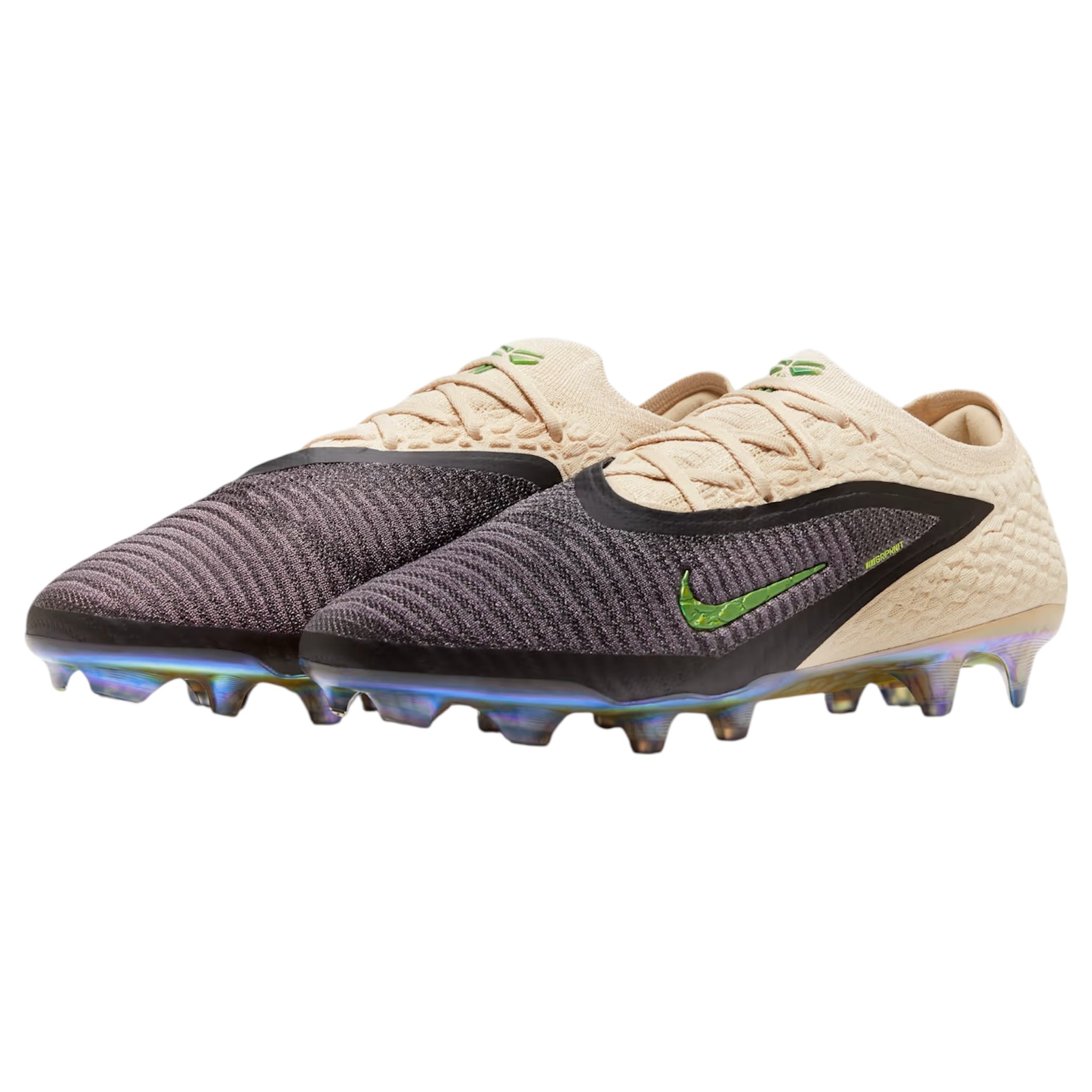 Echoing past “Mamba” sneaker designs, the silhouette showcases a sail reptile-inspired texture. For a striking contrast, iridescent green accents highlight the forefoot Swoosh, heel counter, and tongue logo. Sticking to the “Mamba” theme, the outsole is fitted with cleats designed to resemble fangs. Inside, the design is finished with custom insoles featuring a snakeskin pattern, adding a distinct touch to the boots.