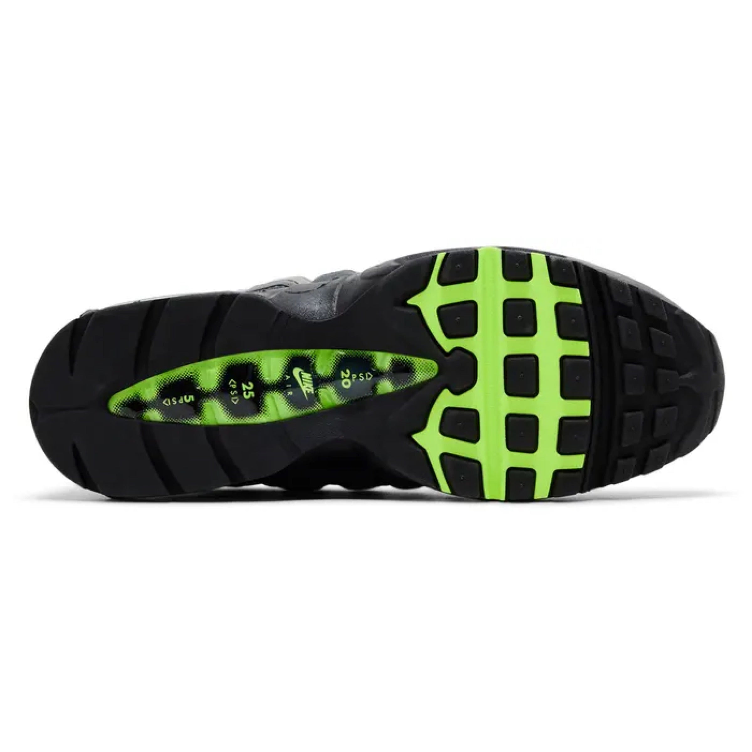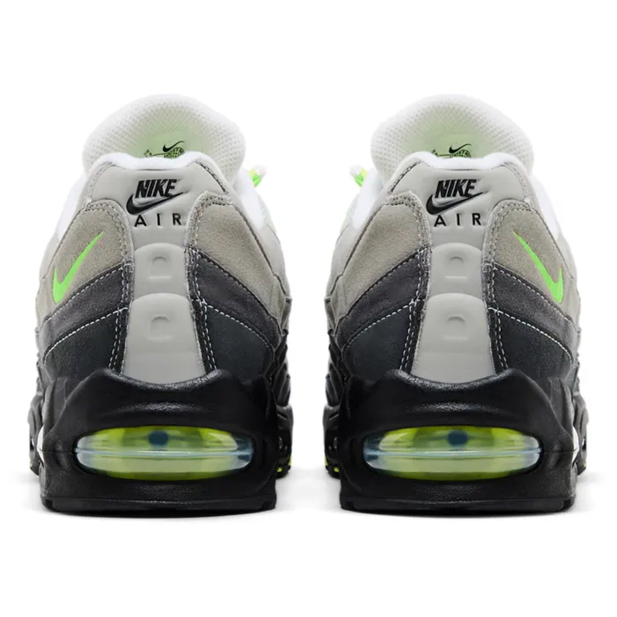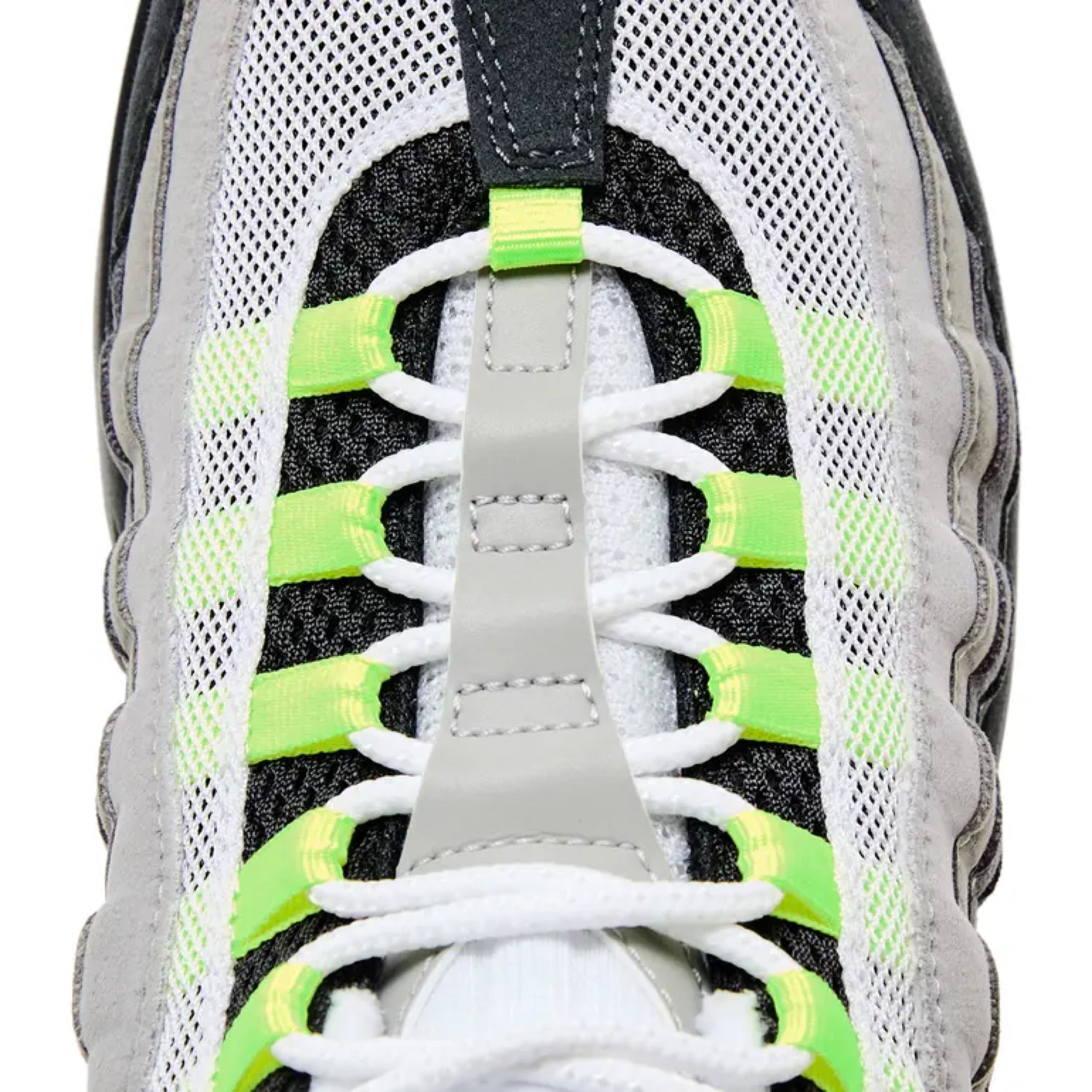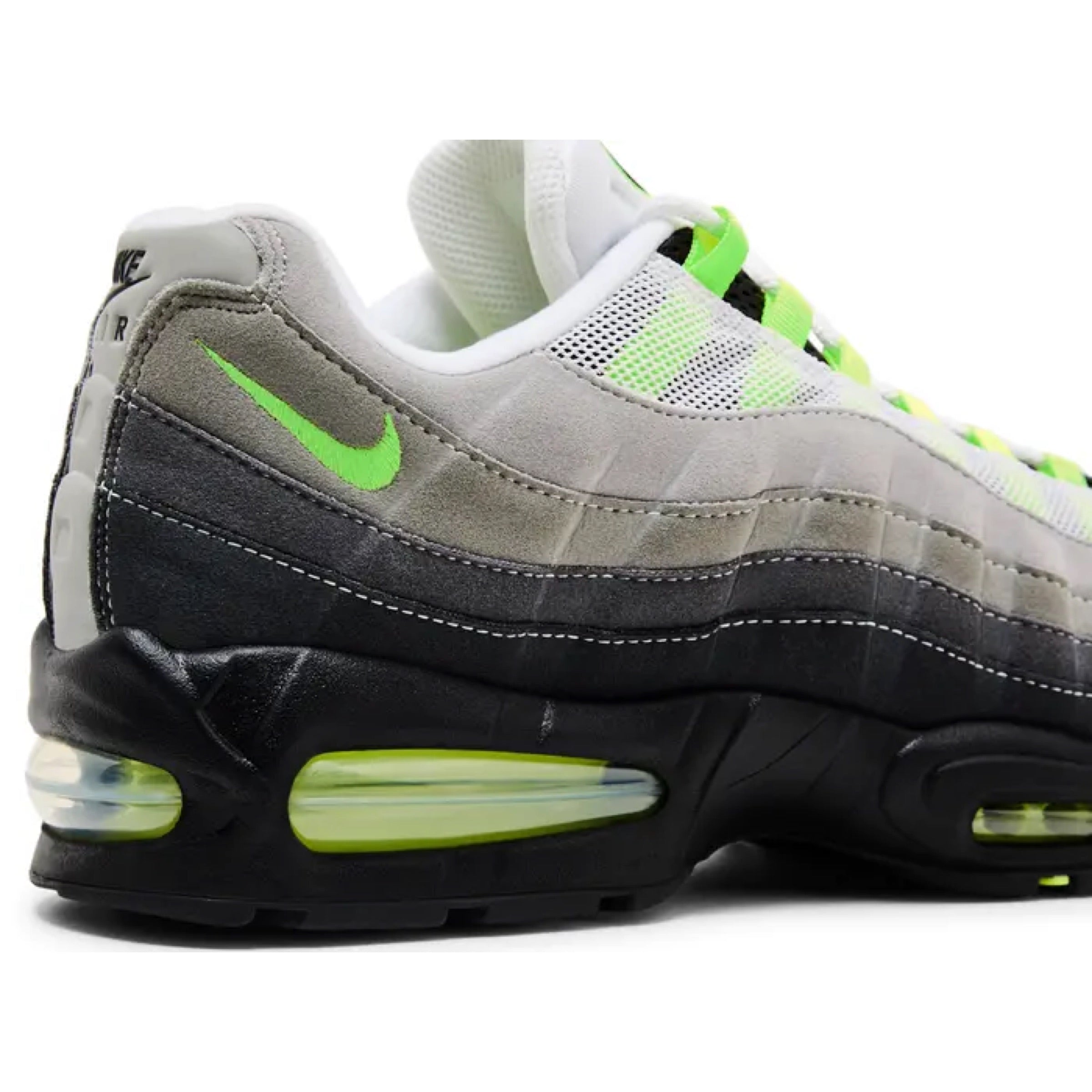 The 2026 edition of the Nike Air Max 95 OG 'Big Bubble - Neon' revives the iconic colorway of the lifestyle runner designed by Sergio Lozano and inspired by the human anatomy. Mimicking the look of muscle fibers, the upper features rippling synthetic suede side panels in a gradient grey finish. The layered build is secured with rope laces that feed through Neon Yellow webbing eyelets that nod to human ribs. A 3M reflective finish coats the lace cover and molded heel panel, marked with debossed Nike Air branding. The sneaker rides atop a black polyurethane midsole with neon-tinted Air-Sole units in the forefoot and heel.