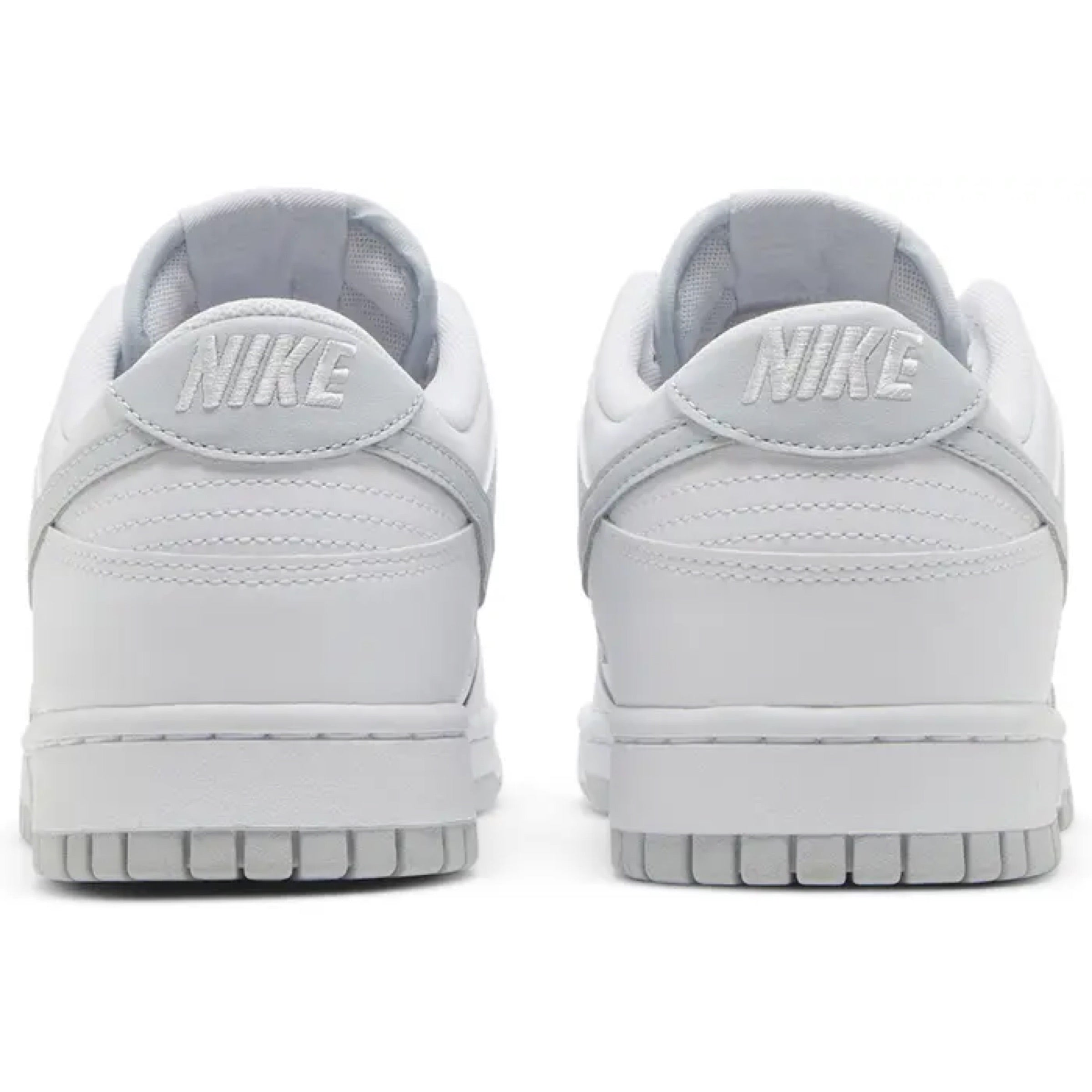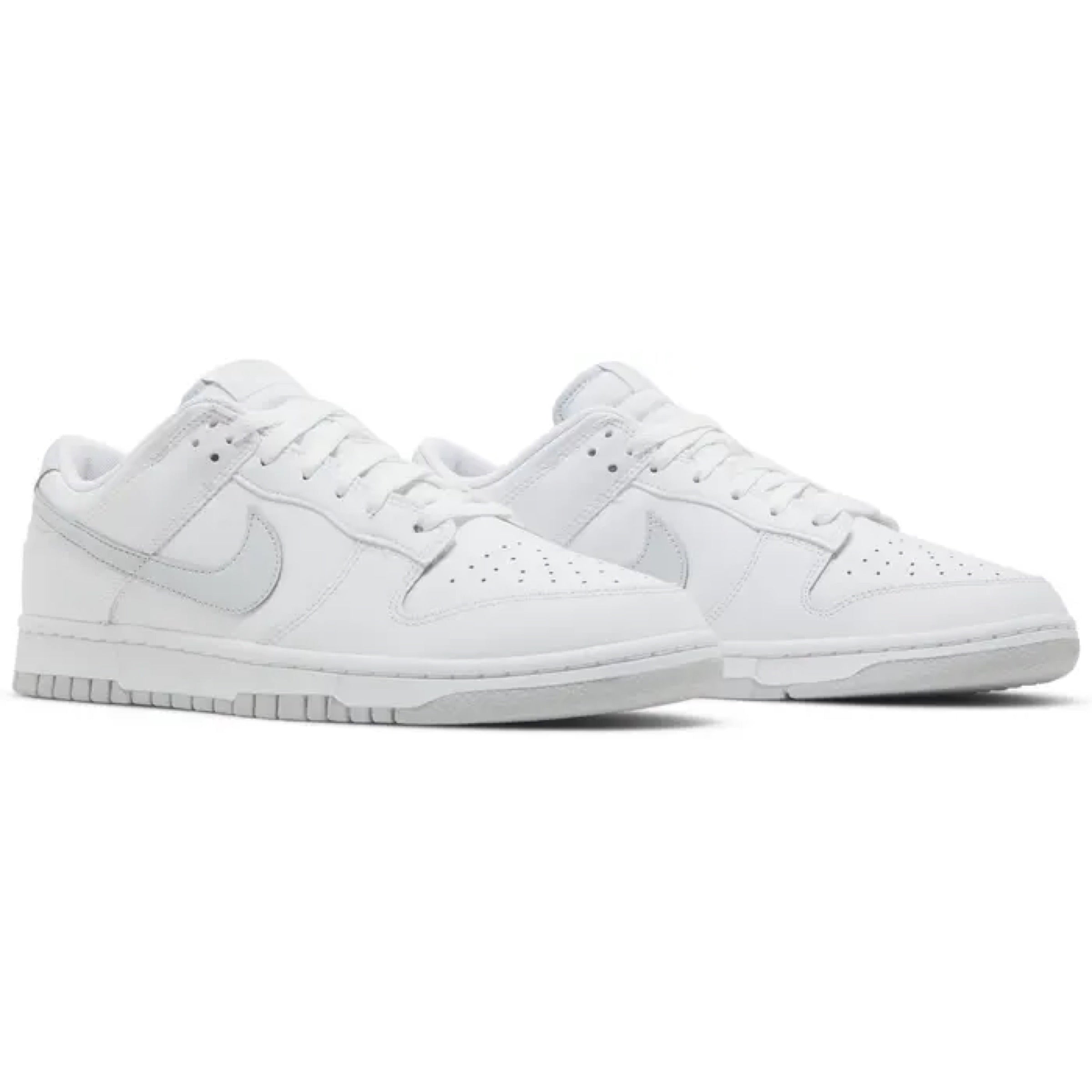 The Nike Dunk Low ‘Pure Platinum’ gives the hardwood icon a blank-slate makeover, allowing the shoe’s classic lines to move to the fore. The low-top carries a white leather upper, accented with a signature Swoosh in pale grey. Heritage details include a perforated toe box and a low-cut padded collar. Nike branding appears on the woven tongue tag, sockliner and heel tab. The sneaker is mounted on a traditional rubber cupsole, featuring stitched sidewall construction and an interior foam wedge.