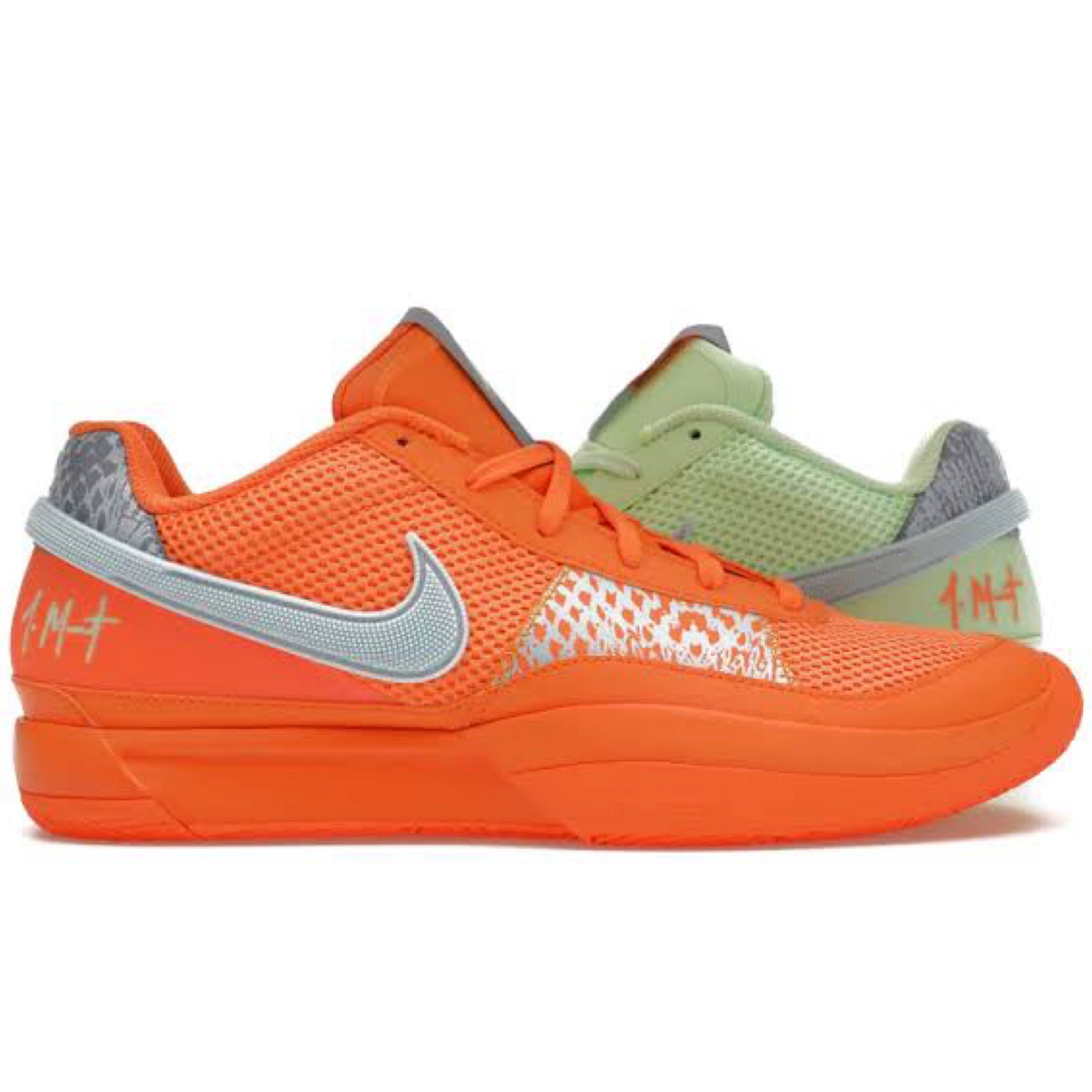 The Nike Ja 1 'Mismatched' showcases contrasting colors between the left and right shoe. A pale blue TPU Swoosh wraps around the heel of each shoe, featuring a Bright Mandarin mesh upper on the right and a Vapor Green mesh upper on the left. Details include a synthetic leather forefoot overlay and Ja Morant's hand-written signature on the lateral heel. The low-top rests on a color-matched Phylon midsole with a springy Zoom Air unit in the forefoot.