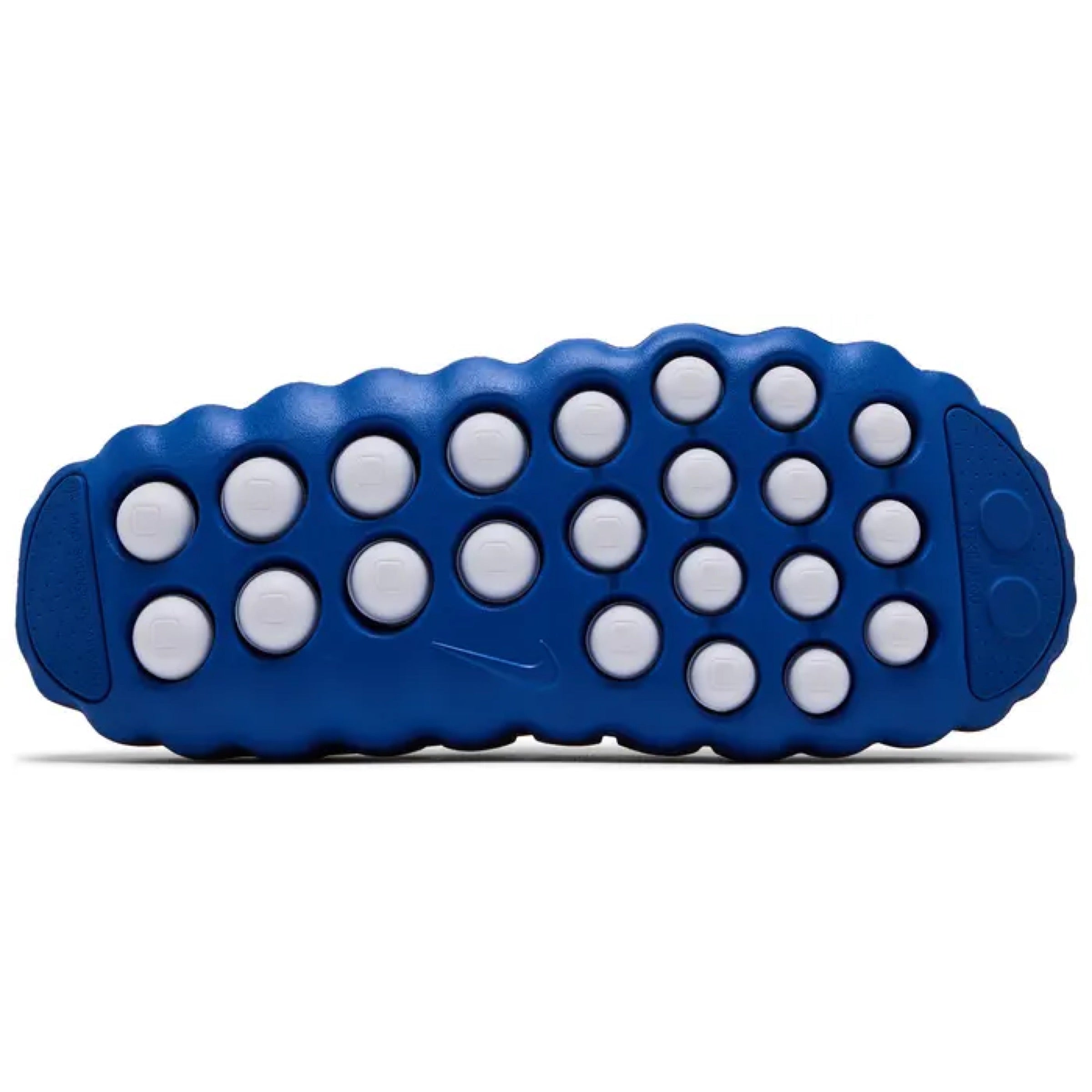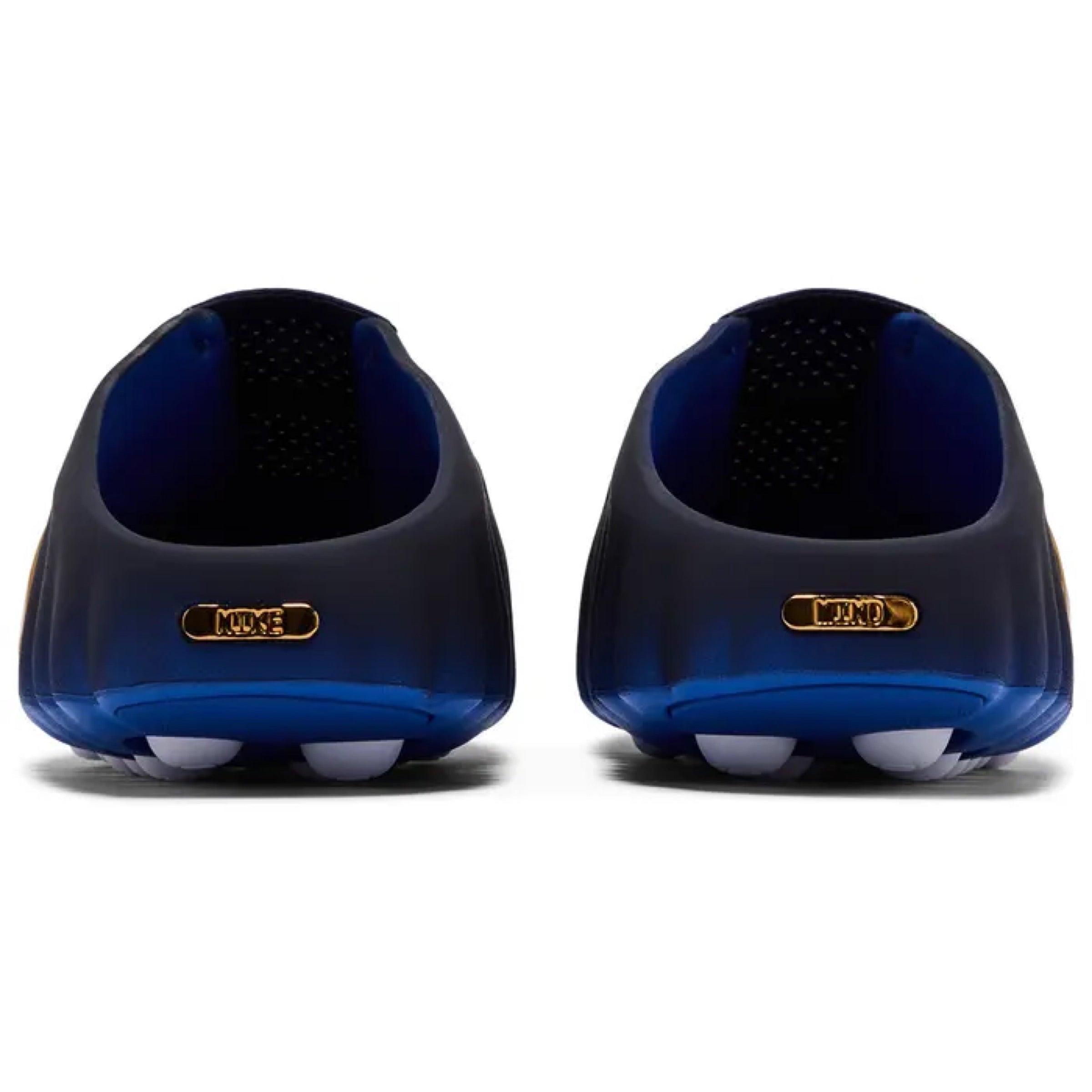 The Nike Mind 001 'Blackened Blue' enhances your pregame routine with a revolutionary approach to footwear. Developed by the Nike Mind Science Department, this mule features a unique outsole with 22 nodes that move independently to activate sensory areas of the brain. The design is intended to help you stay present and connected to your surroundings before the big game. Dressed in a sleek Black and Blue colorway, the shoe utilizes a soft foam midsole for robust cushioning. A breathable knit tongue and perforated details ensure comfort, while the slip-on design allows for easy wear.