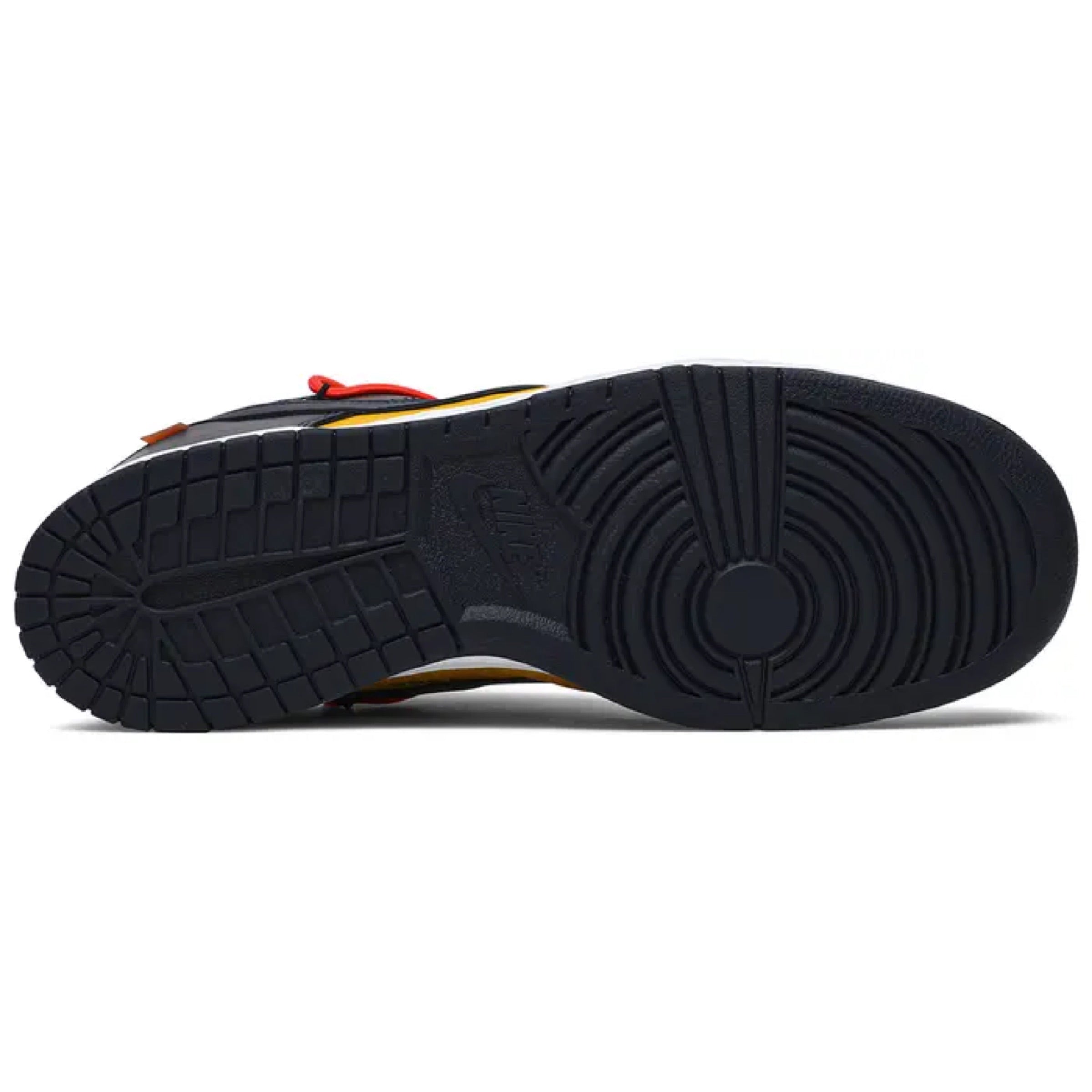 Arrived in December 2019, Off-White and Nike continue their creative partnership by revisiting the Dunk Low for a three-piece capsule. This edition in University Gold and navy leather sports a signature orange flag label on the lateral Swoosh. Virgil Abloh's deconstructed style is exhibited in the form of secondary Flywire lacing, exposed tongue foam and enlarged branding on the medial. The sneaker's split-colored rubber cupsole remains.