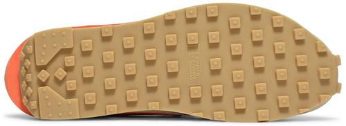The sacai x Clot x Nike LDWaffle ‘Net Orange Blaze’ presents a triple collaboration that takes inspiration from the CLOT x Nike Air Max 1 ‘Kiss of Death,’ originally released in 2006 and reissued in 2021. The hybrid silhouette, which combines elements from the LDV and Waffle Racer, features a tan semi-translucent textile upper with tonal suede overlays at the forefoot and heel. sacai’s signature double Swooshes are rendered in brick red and orange leather, the latter embellished with a subtle snakeskin texture. Lime green accents appear on the double-stacked eyestay, the triple-branded heel tab, and the dual woven tags perched atop the red and orange nylon tongues. A stacked two-tone foam midsole, distinguished by an elongated heel, rides on a waffle-traction gum rubber outsole.