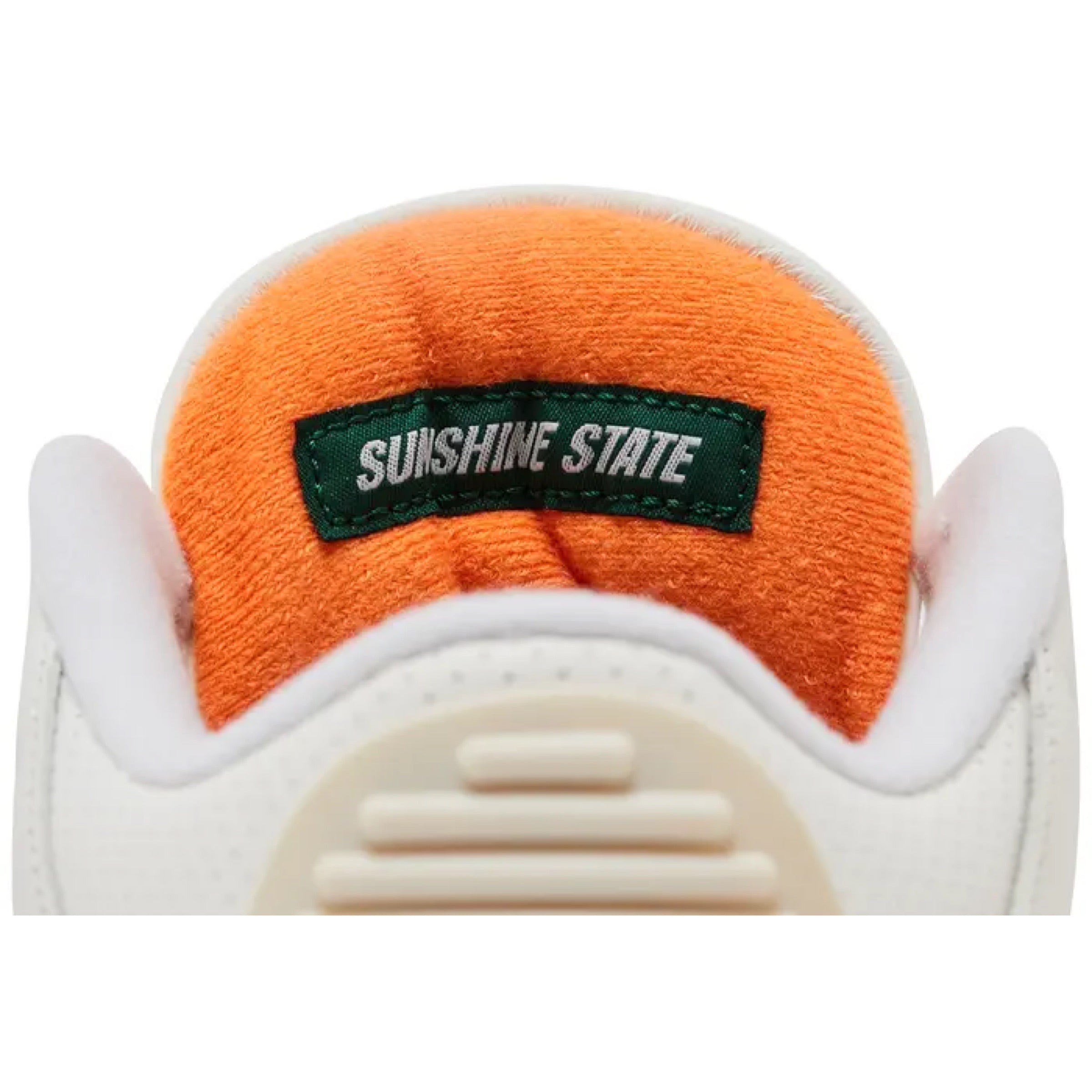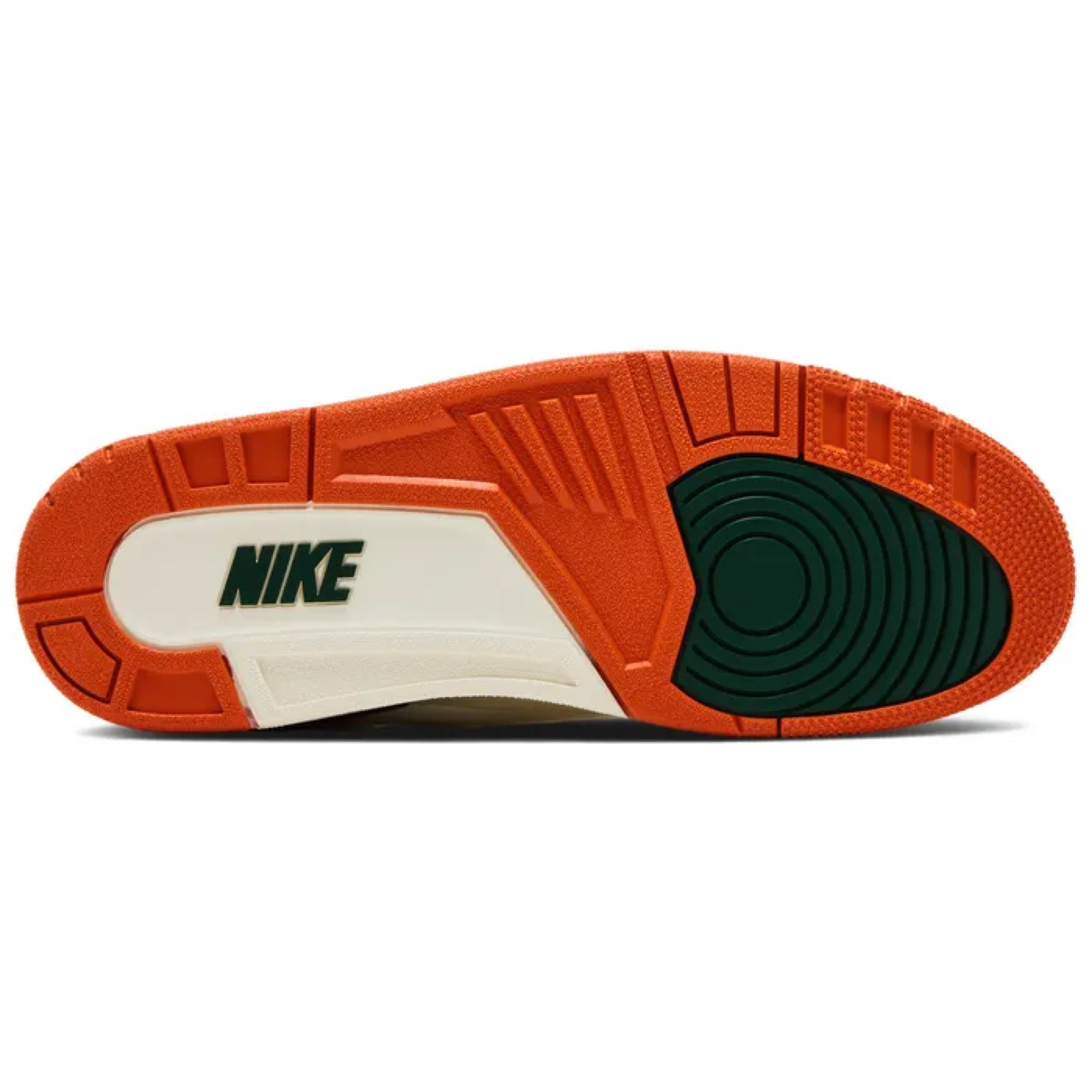 The SoleFly x Air Jordan 3 'Miami' showcases the signature colors of the Miami Hurricanes, featuring a Sail-colored leather upper with orange and green suede overlays at the forefoot and heel. A Jumpman logo adorns the tongue in green embroidery, matching the upper eyelets and the raised Nike Air branding that graces the heel tab. A vintage off-white finish is applied to the polyurethane midsole, fitted with visible Air-sole cushioning and accented with a splash of green along the heel. An orange rubber outsole provides durable traction underfoot.
