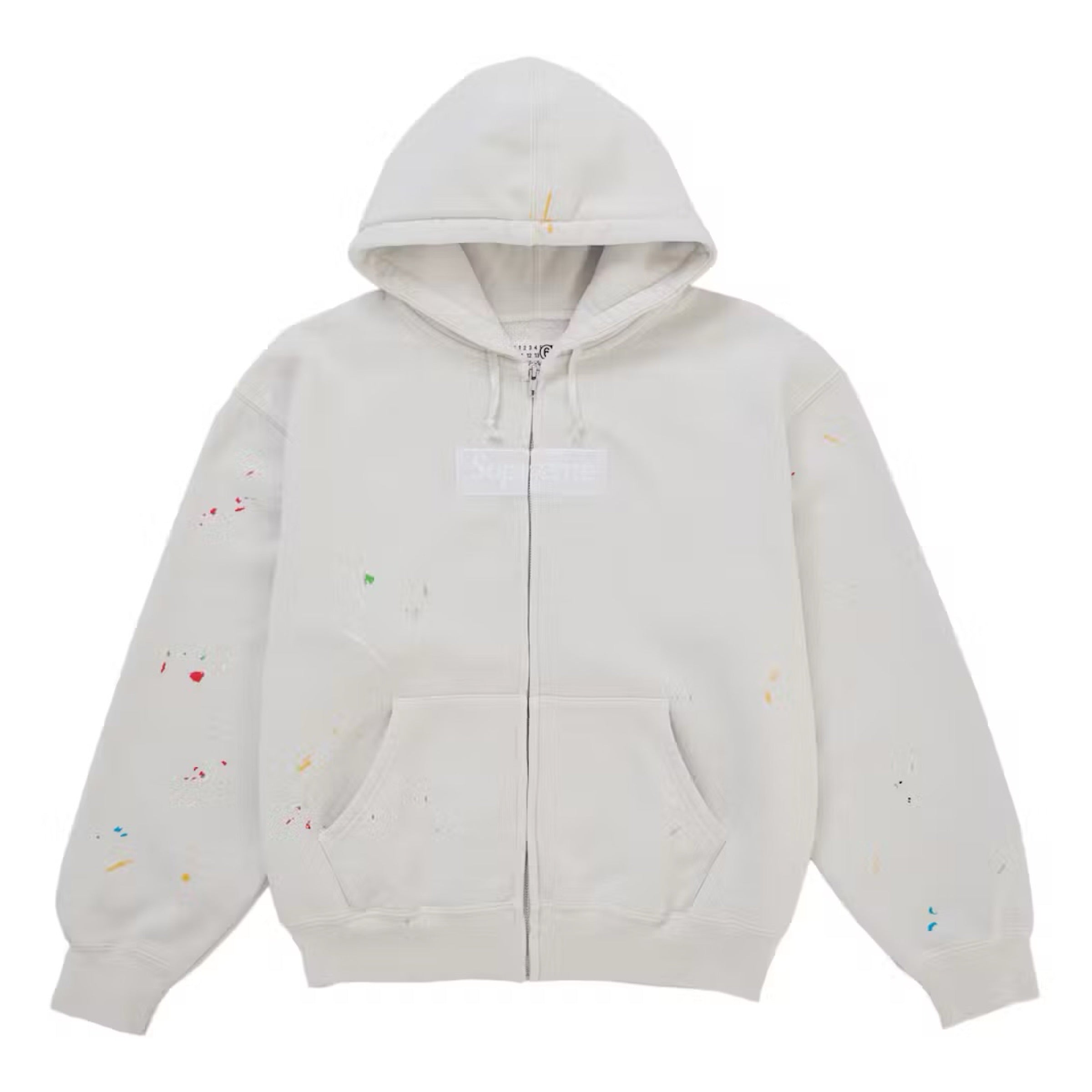 Supreme MM6 Maison Margiela Box Logo Zip Up Hoodie - White Brushed-back fleece with printed paint splatters throughout. Full zip... Read more