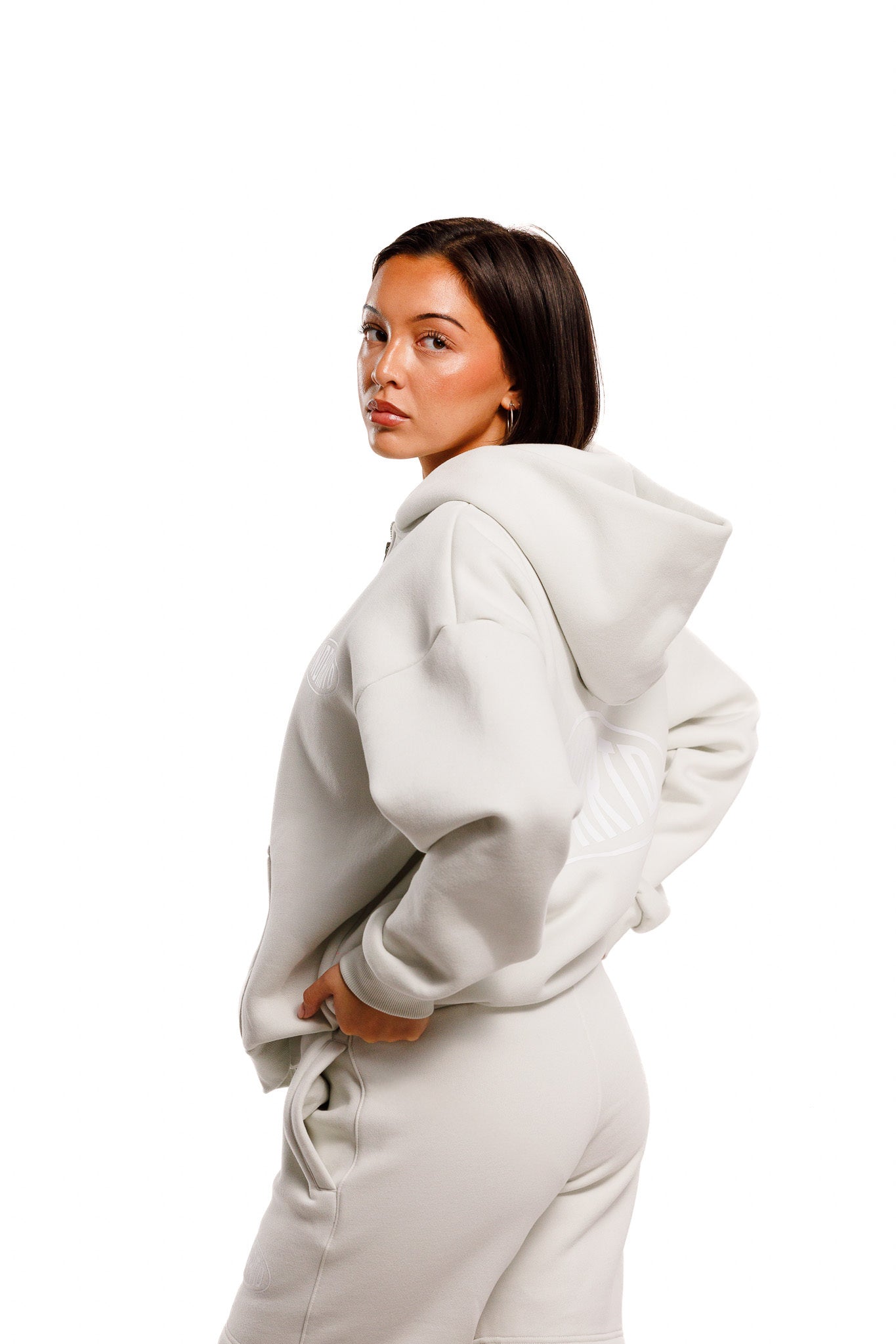 Crafted from a premium cotton-poly fleece blend, the fabric delivers a soft, plush feel with a structured drape. The oversized fit allows for effortless layering, while maintaining a clean, considered silhouette. Finished with a double zip closure, elasticated hem, and cuffed sleeves, every element is designed for both function and refinement.
